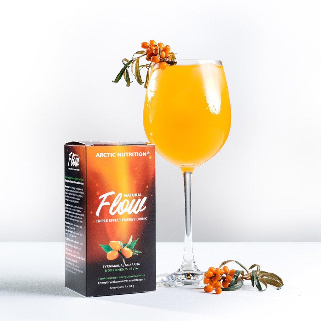 Flow tuoteperheen toinen luonnollinen ja terveellinen energiajuoma. Flown kolmivaikutteisten hyötyjen lisäksi Tyrni Flow tukee ihon hyvinvointia.